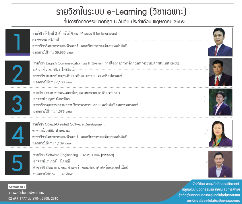 งานผลิตสื่อคอมพิวเตอร์ (e-Learning) ได้ทำการจัดอันดับรายวิชาในระบบ LMS http://lms.rmutp.ac.th/ โดยวัดจากสถิติของกิจกรรม ภายในระบบซึ่งมีวิชาที่มีการเข้าใช้งาน 5 อันดับ ประจำเดือนพฤษภาคม 2559 โดยมีรายละเอียดดังนี้ วิชาสามัญ วิชาชีพเฉพาะ Categories: Uncategorized