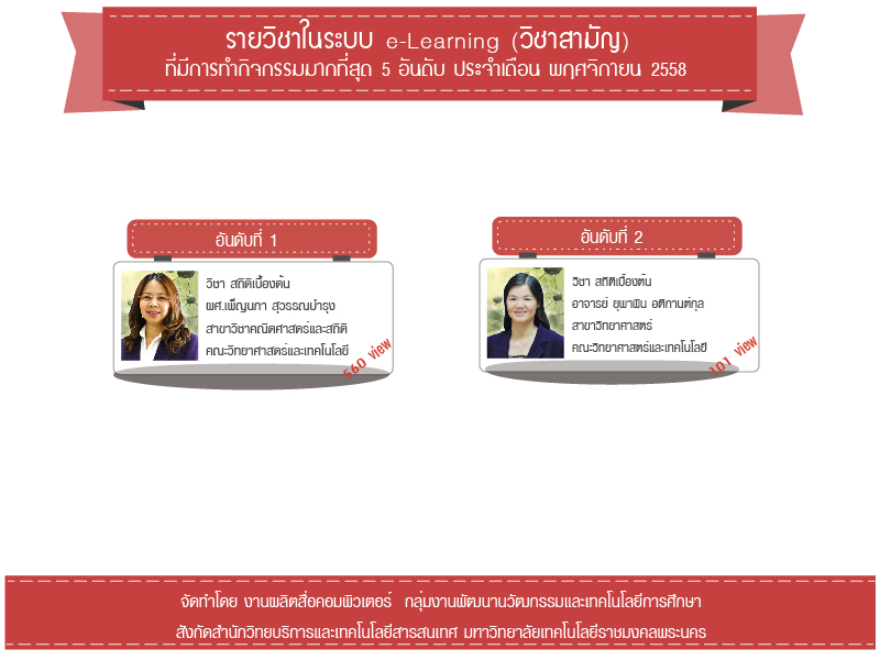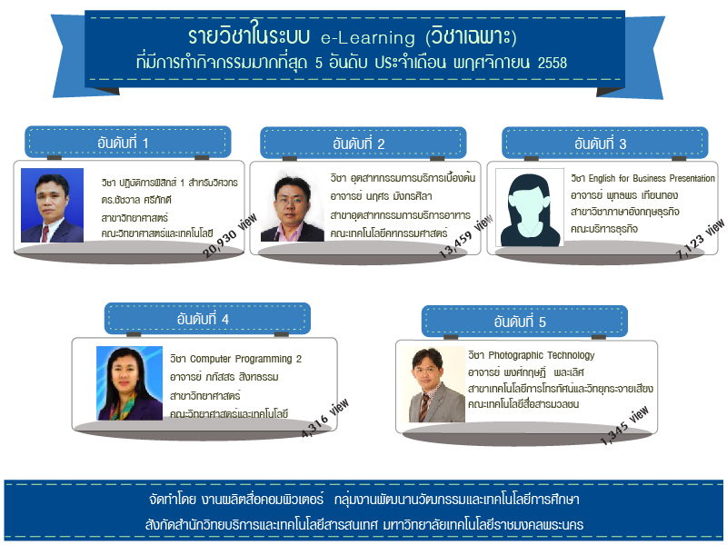 งานผลิตสื่อคอมพิวเตอร์ (e-Learning) ได้ทำการจัดอันดับรายวิชาในระบบ LMS http://lms.rmutp.ac.th/ โดยวัดจากสถิติของกิจกรรม ภายในระบบซึ่งมีวิชาที่มีการเข้าใช้งาน 5 อันดับ ประจำเดือนพฤศจิกายน 2558 โดยมีรายละเอียดดังนี้