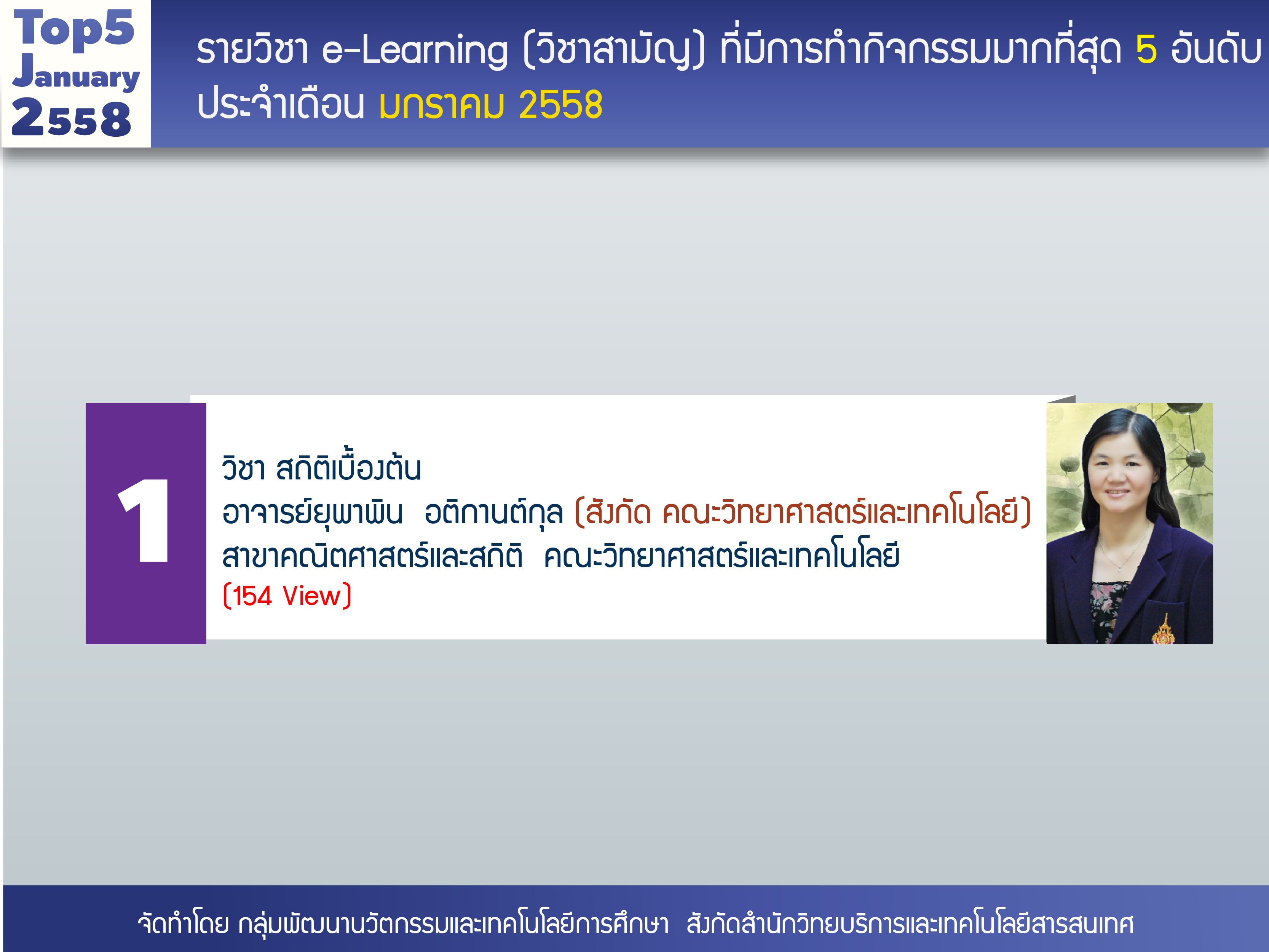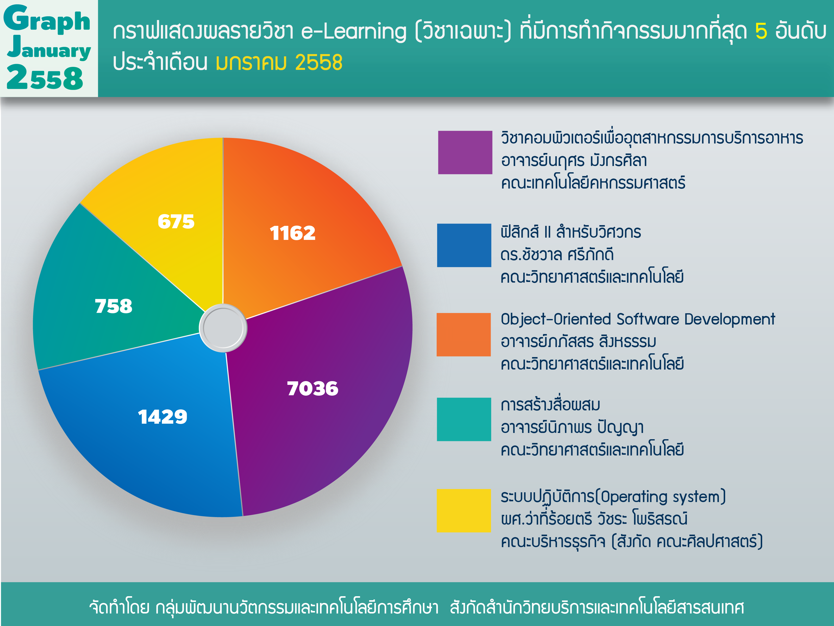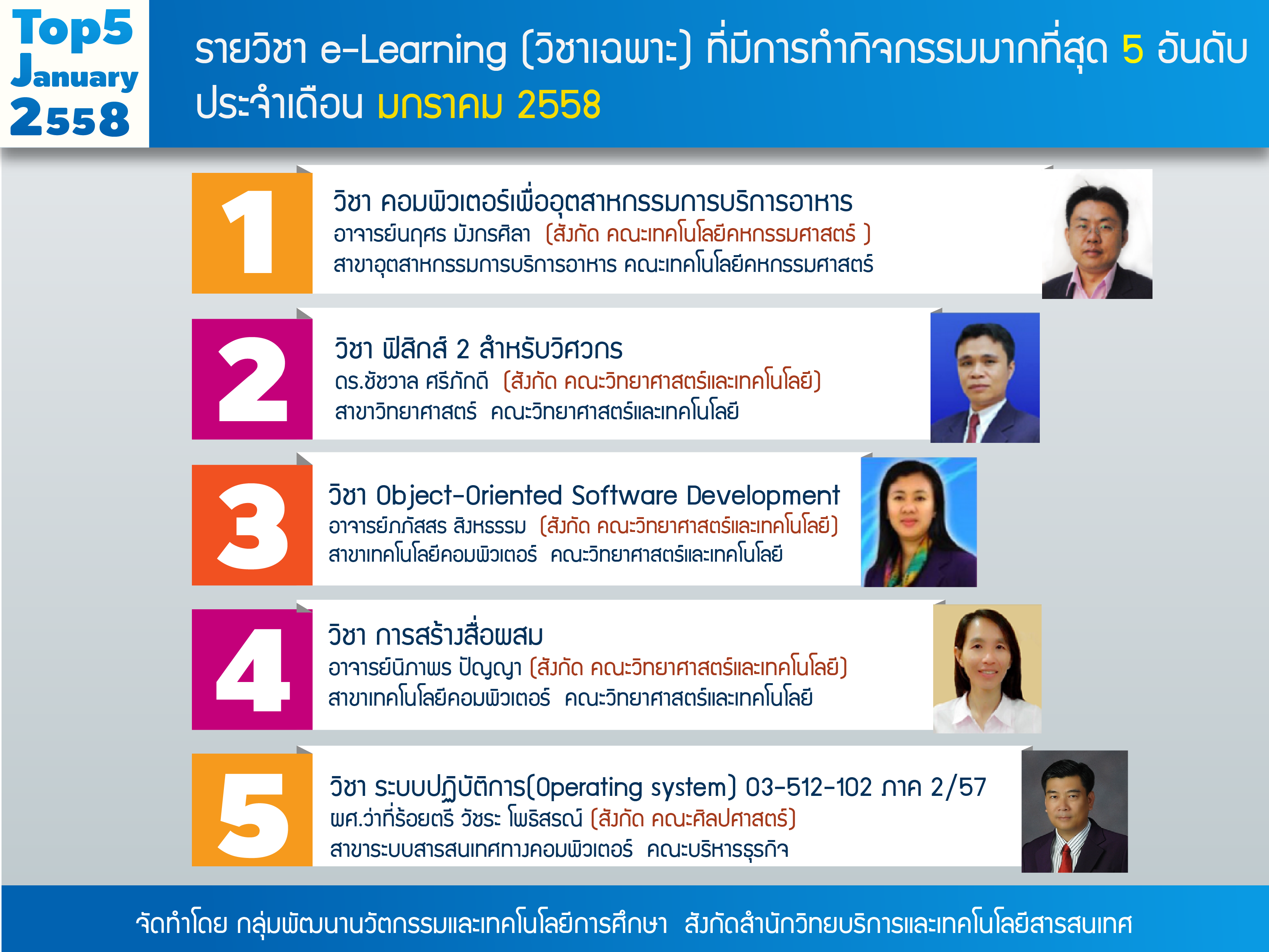 งานผลิตสื่อคอมพิวเตอร์ (e-Learning) ได้ทำการจัดอันดับรายวิชาในระบบ LMS http://lms.rmutp.ac.th/ วัดจากสถิติของกิจกรรมโดยแบ่งออกเป็น กลุ่มวิชาสามัญ และกลุ่มวิชาเฉพาะ มาอย่างละ 5 อันดับ ประจำเดือนมกราคม 2558 โดยมีรายละเอียดดังนี้