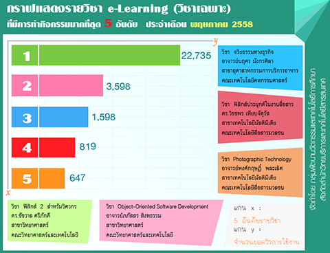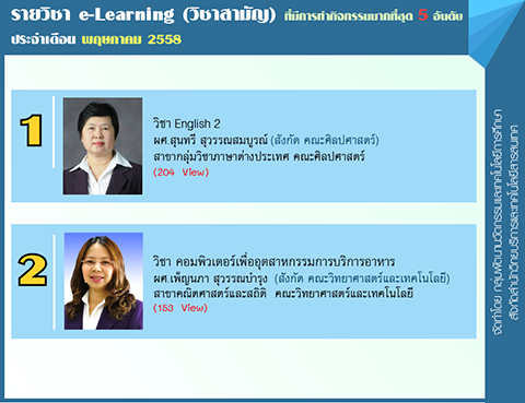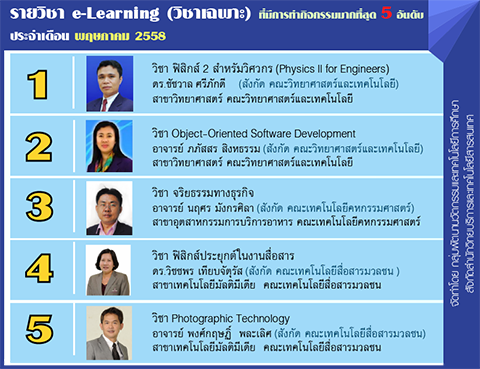 งานผลิตสื่อคอมพิวเตอร์ (e-Learning) ได้ทำการจัดอันดับรายวิชาในระบบ LMS http://lms.rmutp.ac.th/ โดยวัดจากสถิติของกิจกรรม ภายในระบบซึ่งมีวิชาที่มีการเข้าใช้งาน 5 อันดับ ประจำเดือนพฤษภาคม 2558 โดยมีรายละเอียดดังนี้