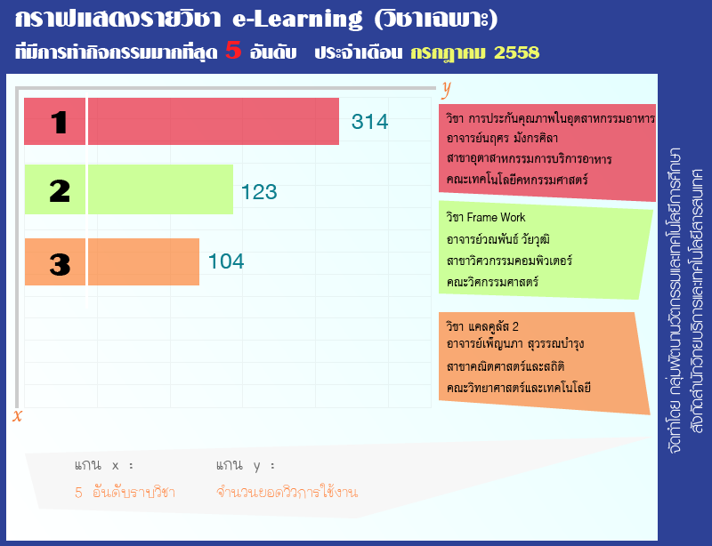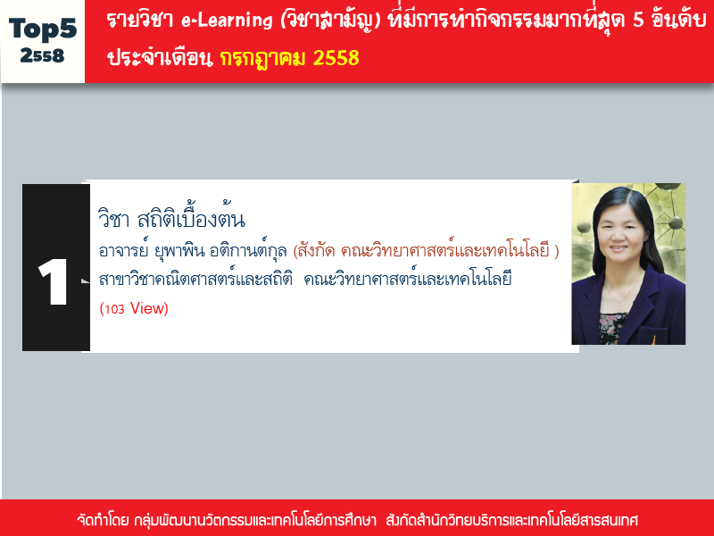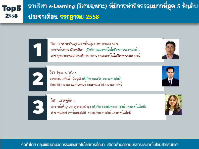 งานผลิตสื่อคอมพิวเตอร์ (e-Learning) ได้ทำการจัดอันดับรายวิชาในระบบ LMS http://lms.rmutp.ac.th/ โดยวัดจากสถิติของกิจกรรม ภายในระบบซึ่งมีวิชาที่มีการเข้าใช้งาน 5 อันดับ ประจำเดือนกรกฎาคม 2558 โดยมีรายละเอียดดังนี้