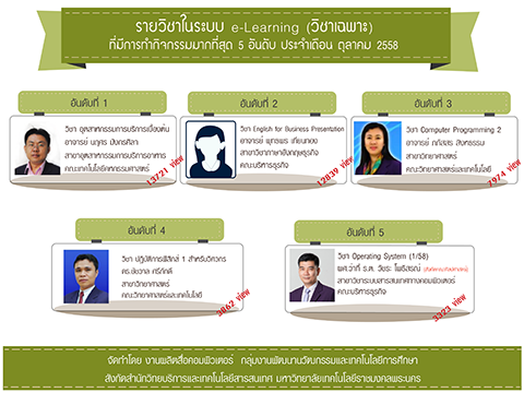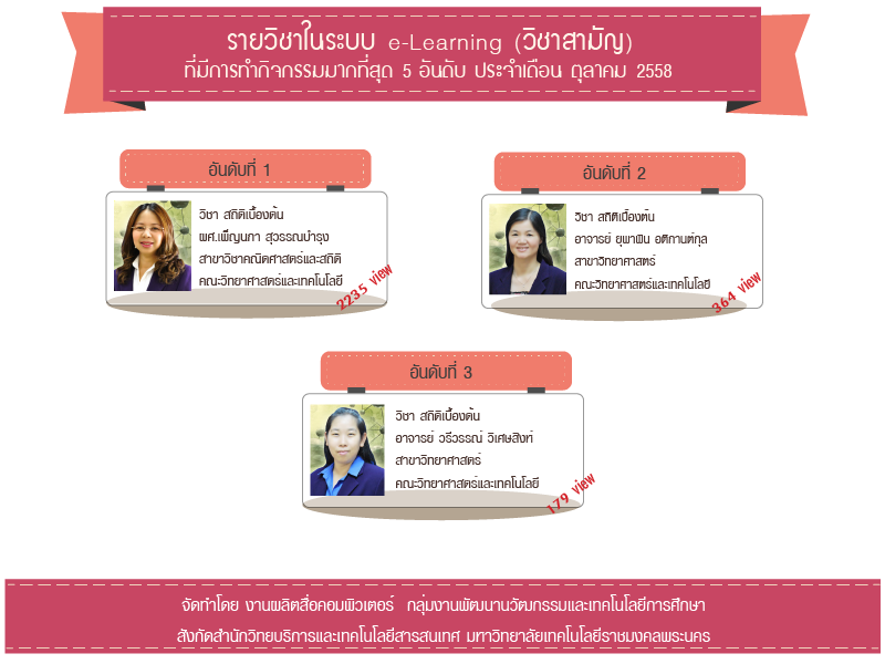 งานผลิตสื่อคอมพิวเตอร์ (e-Learning) ได้ทำการจัดอันดับรายวิชาในระบบ LMS http://lms.rmutp.ac.th/ โดยวัดจากสถิติของกิจกรรม ภายในระบบซึ่งมีวิชาที่มีการเข้าใช้งาน 5 อันดับ ประจำเดือนตุลาคม 2558 โดยมีรายละเอียดดังนี้