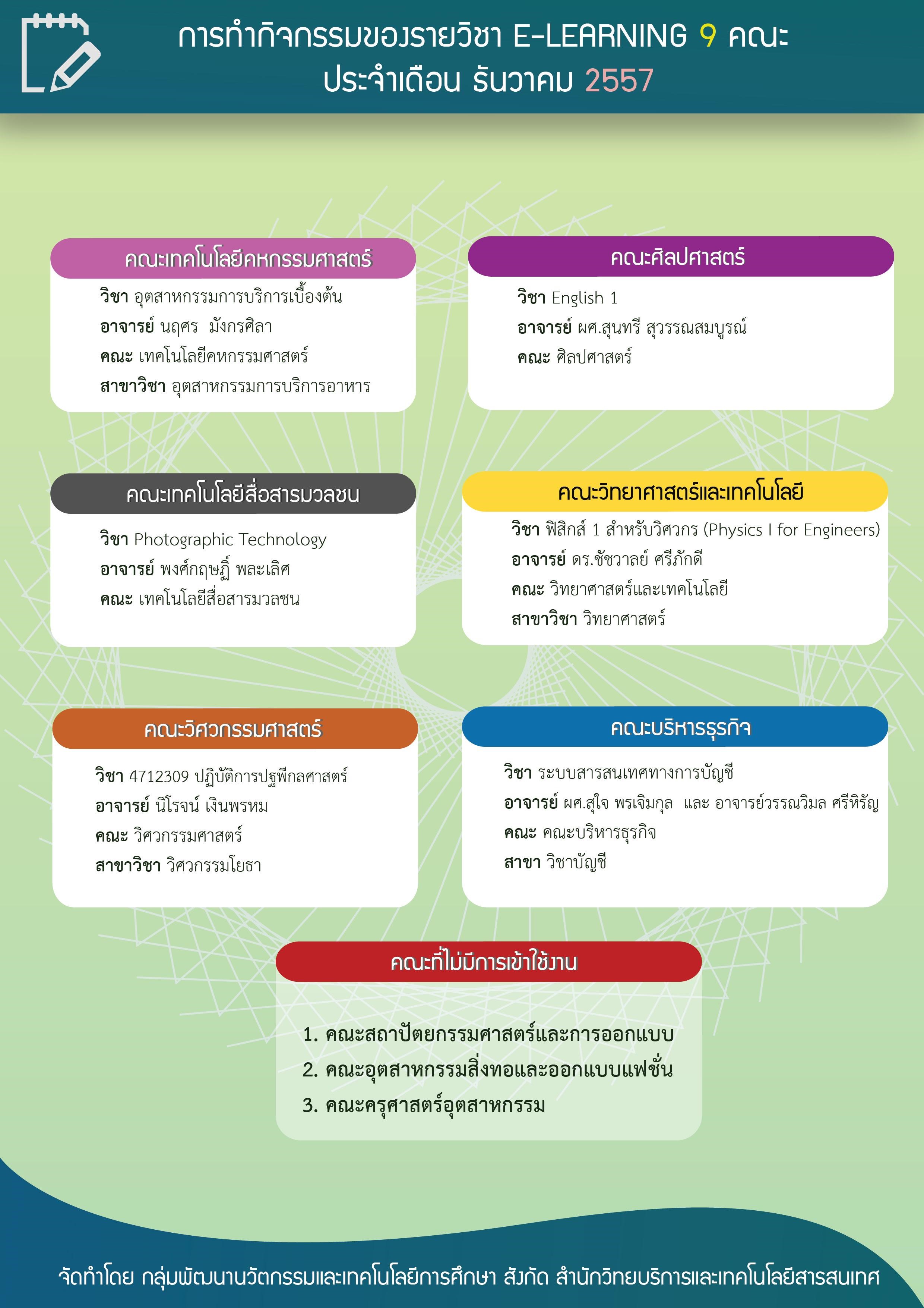 งานผลิตสื่อคอมพิวเตอร์ (e-Learning) ได้ทำการแจ้งรายละเอียด ความเคลื่อนไหวของรายวิชา LMS 9 คณะ ประจำเดือน ธันวาคม 2557