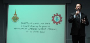วันที่ ๒๑ มีนาคม ๒๕๕๕ …Studio News… เมื่อวันที่ 12 – 16 มีนาคม 2555 ที่ผ่านมา ได้มีการจัดโครงการอบรมเชิงปฏิบัติการ In-Country Training Programme หัวข้อ “MANAGING M-LEARNING (MOBILE LEARNING)” ณ มหาวิทยาลัยเทคโนโลยีราชมงคลธัญบุรี จังหวัดปทุมธานี โดยทางศูนย์ SEAMEO VOCTECH ได้ส่งผู้เชี่ยวชาญมาเป็นวิทยากรบรรยายในโครงการ |