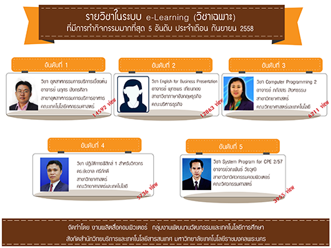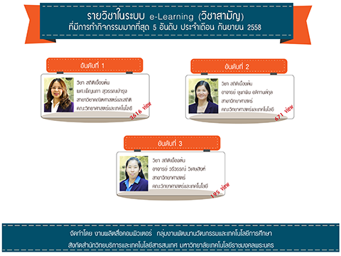 งานผลิตสื่อคอมพิวเตอร์ (e-Learning) ได้ทำการจัดอันดับรายวิชาในระบบ LMS http://lms.rmutp.ac.th/ โดยวัดจากสถิติของกิจกรรม ภายในระบบซึ่งมีวิชาที่มีการเข้าใช้งาน 5 อันดับ ประจำเดือนกันยายน 2558 โดยมีรายละเอียดดังนี้